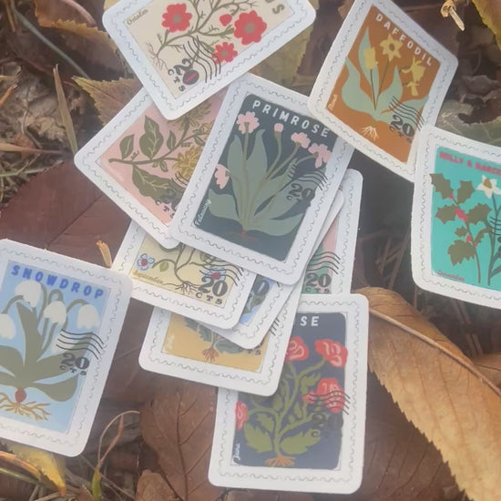 Each birth flower, in a unique stamp-themed design.
